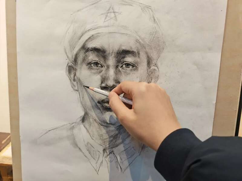 “除了口述,很多时候我们只能靠亲属的模样来反推烈士的长相。”安徽师范大学美术学院辅导员、“红色青春守护人”工作室负责人王伟介绍,为了最大程度还原烈士的样貌,志愿者们做了大量的工作:倾听亲属的回忆,比对烈士子女照片,查阅大量的史料,研究烈士所在年代的服饰、发型特征,“只为让作品经得起历史和亲人的检验”。