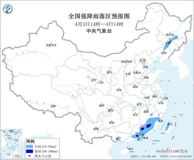 r预计,4月3日14时至4日14时,黑龙江南部、吉林中部、辽宁北部、江西南部、福建中西部、广西南部、广东中东部、台湾岛中西部等地部分地区有大雨,其中,江西南部、福建西南部、广东中部和北部等地部分地区有暴雨(50~80毫米)。上述部分地区伴有短时强降水(最大小时降雨量20~50毫米,局地可超过60毫米),局地有雷暴大风、冰雹等强对流天气。此外,黑龙江中西部、吉林西部等地部分地区有大到暴雪。