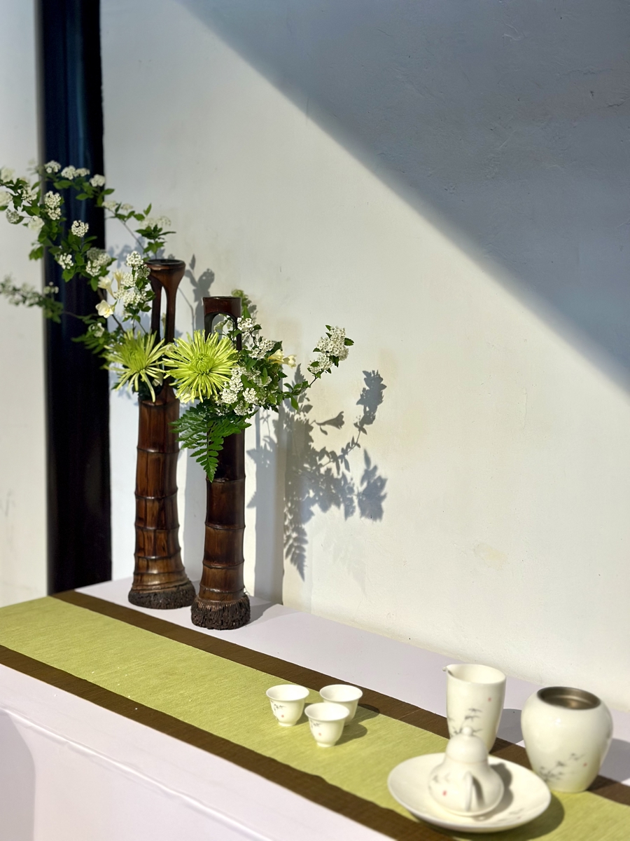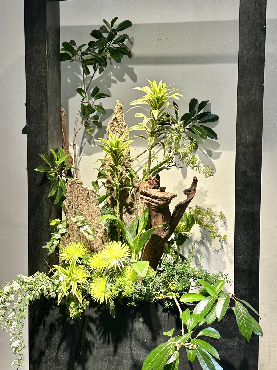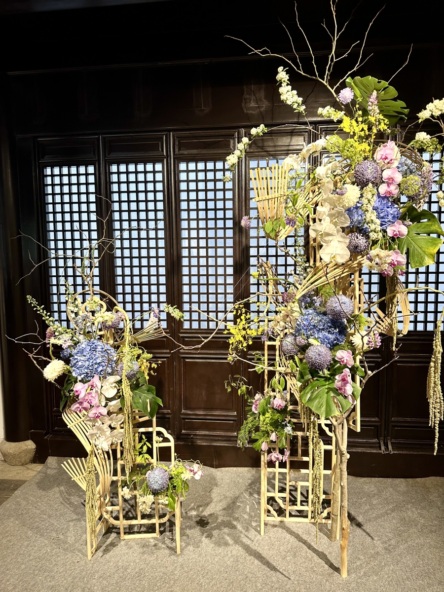 比如《浮光-寂》,将插花、竹筒与茶席结合,巧妙地将楼梯下的斜角变成一处光影变换的小景,借势造势。又如《紫棂青序》,以竹篾为骨铺展层叠的花境,插在试管中的鲜切花吊在半空立体呈现,静美而有风骨。据悉,这款作品由即将代表中国参加世界技能大赛花艺项目的选手和老师带来,展示了当下流行的西式花艺手法。