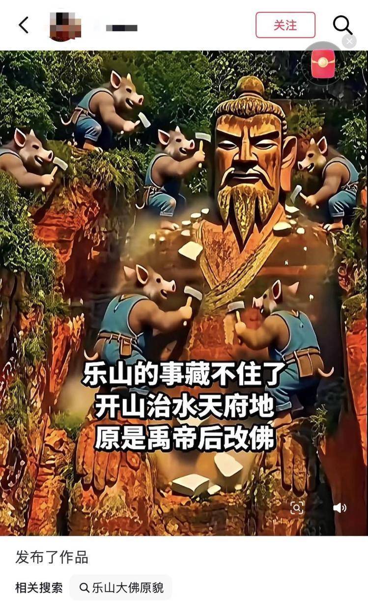 记者注意到,“乐山大佛是大禹雕像改建”的说法可追溯至数年前,近期再度被部分网民以视频、帖文形式,进行传播。不少内容还是AI生成,以及通过P图将乐山大佛头像换成大禹头像,并配文:甭管真假,看着顺眼多了。