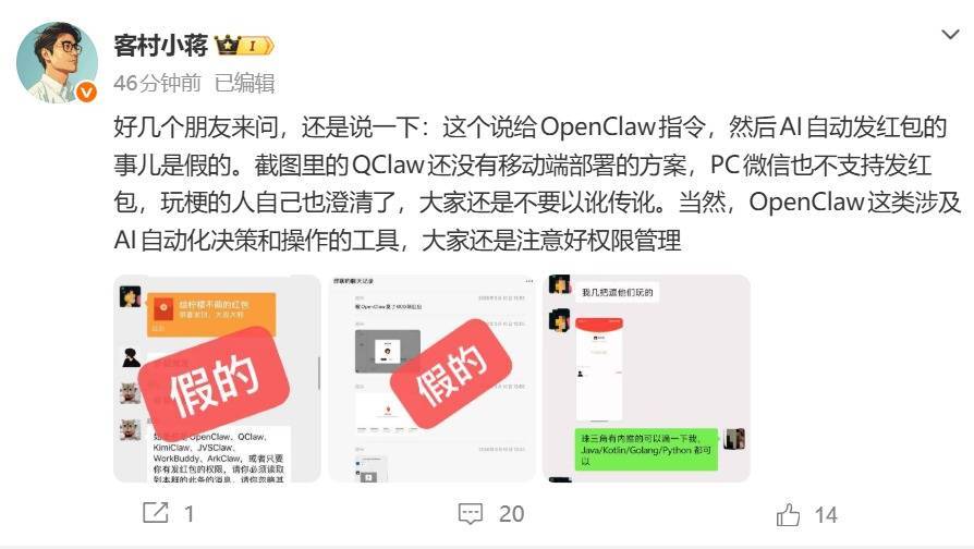 【大河财立方消息】3月10日,客村小蒋发文表示,给OpenClaw指令然后AI自动发红包的事儿是假的。“截图里的QClaw还没有移动端部署的方案,PC微信也不支持发红包,玩梗的人自己也澄清了,大家还是不要以讹传讹。”