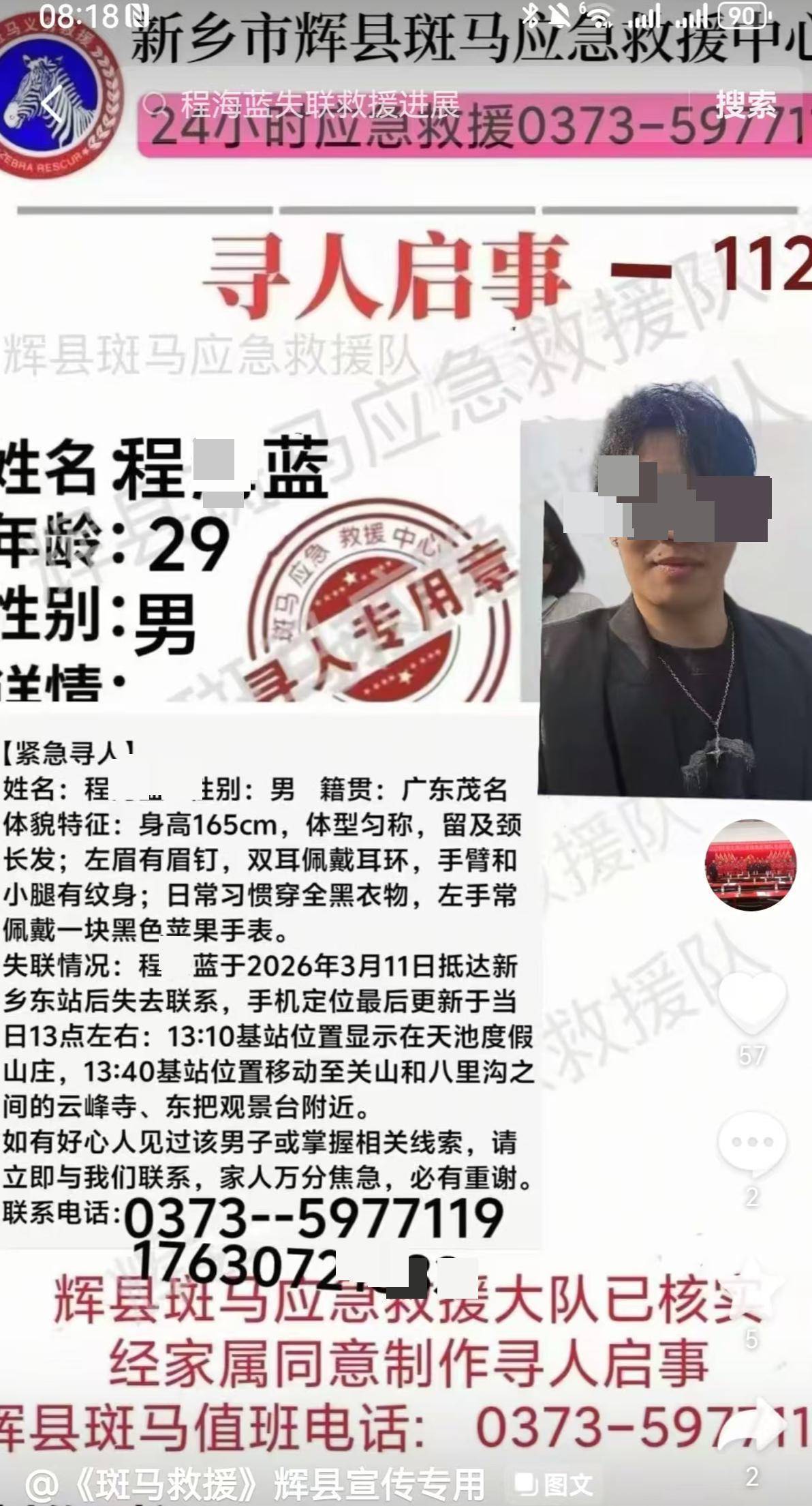 根据辉县斑马应急救援发布的寻人启事,程某蓝,29岁,男,籍贯广东茂名,身高165厘米,体型匀称,留及颈长发;左眉有眉钉,双耳佩戴耳环,手臂和小腿有纹身。日常习惯穿全黑衣物,左手常佩戴一块苹果手表。